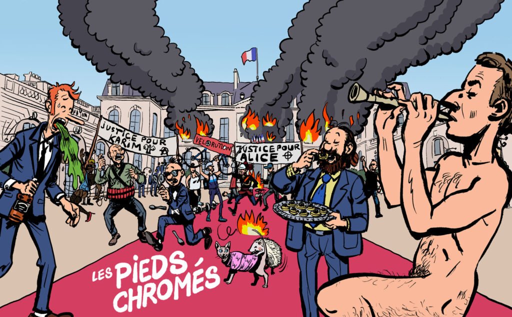 Nos trois amis, dépourvus de toute idéologie et de tout scrupule, vont en profiter pour s’en mettre plein les poches ! Politiciens, artistes engagés, chanteurs, journalistes, patrons sans scrupules, producteurs de cinéma, philosophes de plateaux, jusqu’au leader suprême de l’Élysée : tous les tartuffes vont passer par les fourches caudines des Pieds Chromés, pour notre plus grand plaisir !